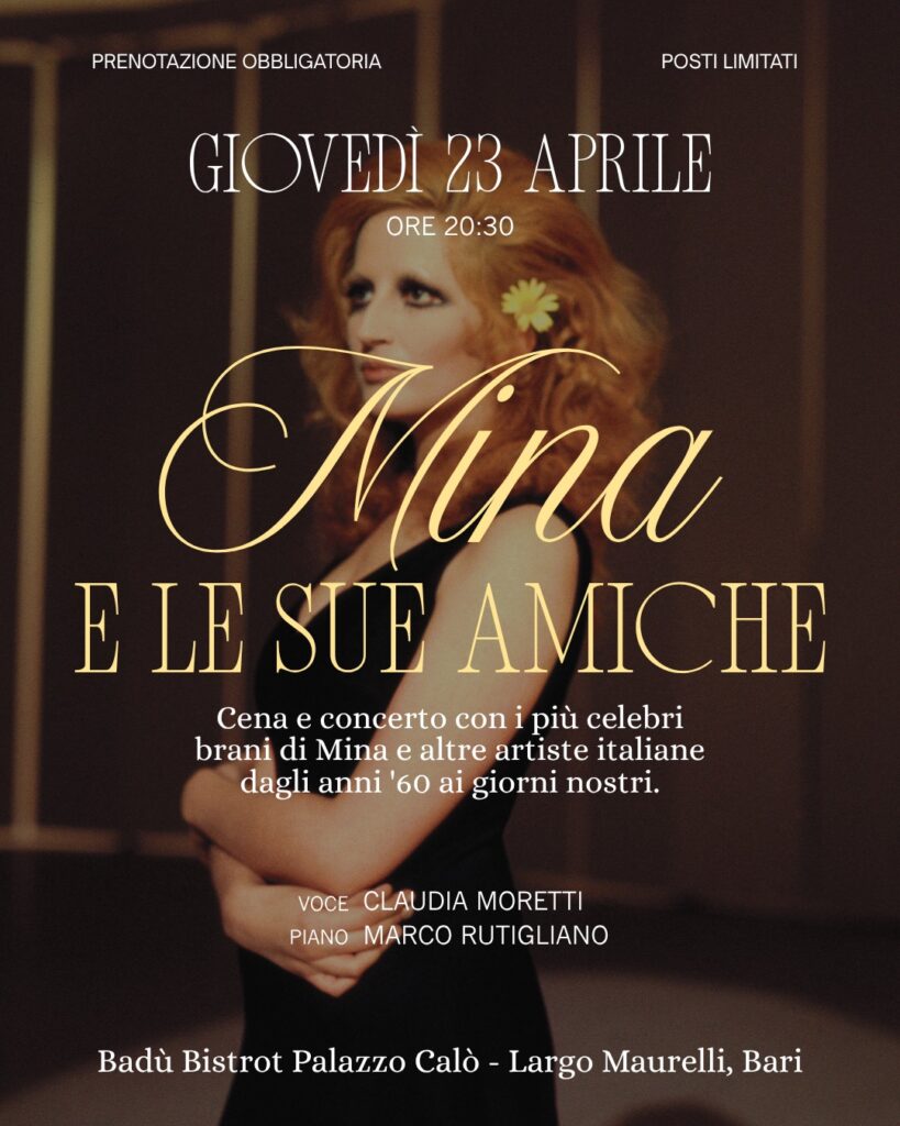 Una cena concerto dedicata ai brani più iconici di Mina e delle grandi interpreti italiane, dagli anni ’60 fino a oggi, con la voce di Claudia Moretti e il piano di Marco Rutigliano.